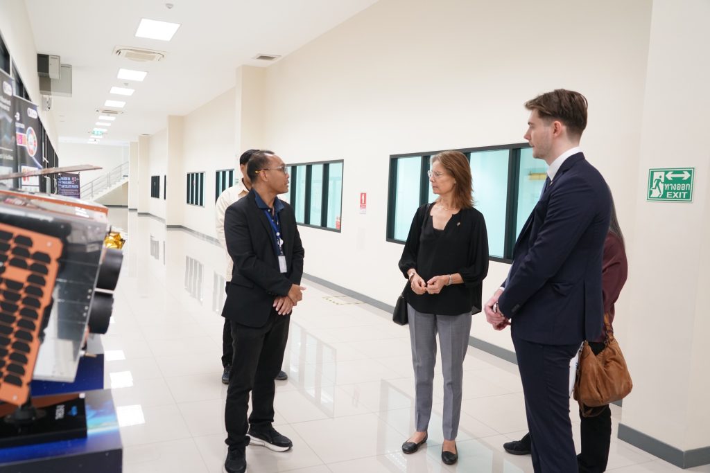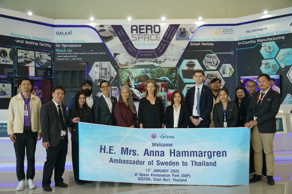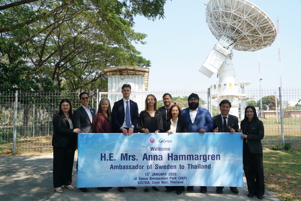 สำนักงานพัฒนาเทคโนโลยีอวกาศและภูมิสารสนเทศ (สทอภ.) หรือ GISTDA เปิดพื้นที่ต้อนรับ H.E. Mrs. Anna Hammargren เอกอัครราชทูตสวีเดนประจำประเทศไทยและคณะทำงานเข้าศึกษาดูงาน โดยมีนางกานดาศรี ลิมปาคม รองผู้อำนวยการ สทอภ. หรือ GISTDA ให้การต้อนรับ ณ อุทยานรังสรรค์นวัตกรรมอวกาศ อ.ศรีราชา จ.ชลบุรี ในวันที่ 13 มกราคม 2569